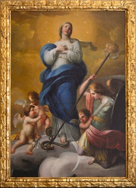 Restauración de un magnífico óleo sobre lienzo que representa a la Inmaculada Concepción rodeada de querubines que portan algunos de sus atributos, y al Arcángel San Miguel alanceando a la serpiente simbólica del pecado original. Dadas algunas similitudes técnicas, compositivas y tipológicas, pensamos que el autor desconocido por ahora de la obra debió ser alguien próximo a Francisco Bayeu, pintor de cámara de los reyes Carlos III y Carlos IV. Así como maestro de tantos pintores de renombre de la segunda mitad del siglo XVIII, y director de la Academia de Bellas Artes de San Fernando de Madrid.