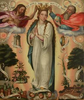 Pintura al óleo sobre tabla de Cristóbal LLorens. Su estilo personal, si bien no alcanza el nivel de calidad de su maestro Joan de Joanes, sigue fielmente en cuanto a ejecución técnica, cromatismo e incluso composiciones, el modo de hacer de este. El tema representado es la coronación de la Virgen María por Jesucristo y El Padre Eterno. Ésta además se halla flanqueada por su pertinente simbología mariana con sus correspondientes filacterias.