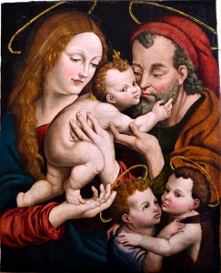 Esta obra representa a la Sagrada Familia con los dos Santos Juanes niños. Es una composición que repite otro esquema idéntico que el mismo Joan de Joanes hizo de dicha Sagrada Familia y que tanta fortuna tuvo, pues hubo muchas más obras con algunas variantes, como es este caso. Esta es una pieza idéntica salvo por la inclusión de los dos santos Juanes niños. Probablemente sea una realización de un pintor del mismo taller de Joan de Joanes. La obra pertenece a una colección privada valenciana. Esta restauración fue realizada en 2020.