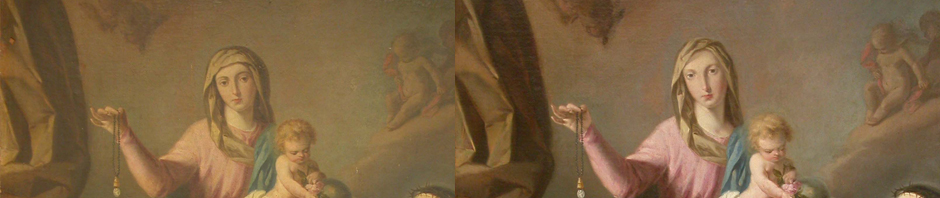 Óleo sobre lienzo, de 126,5 por 93,5 cm. Es posible que haya sido reducido en anchura a tenor de las apreciaciones que hicimos durante su restauración. Lo restauramos en 2012. Aparte de los daños típicos de oxidación del barniz y acumulación de polvo, esta obra presentaba al menos tres otras intervenciones anteriores. La última había sido hecha en 1963 y, como curiosidad, se modificaron los ojos de la Virgen, el tocado que le cubría la frente y se ensombrecieron algunas zonas, todo ello sin otra razón que la meramente estética del gusto personal del restaurador que lo hizo.