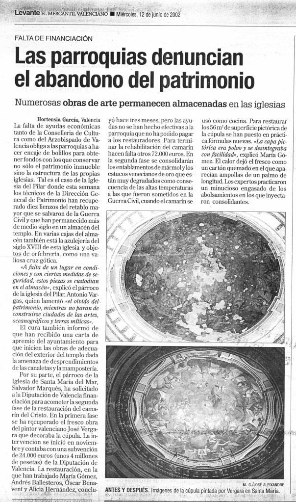 Artículo publicado en el diario Levante-emv el 12 de junio de 2002 referente a la restauración del camarín del trasagrario de José Vergara de la iglesia de Santa María del Mar de Valencia