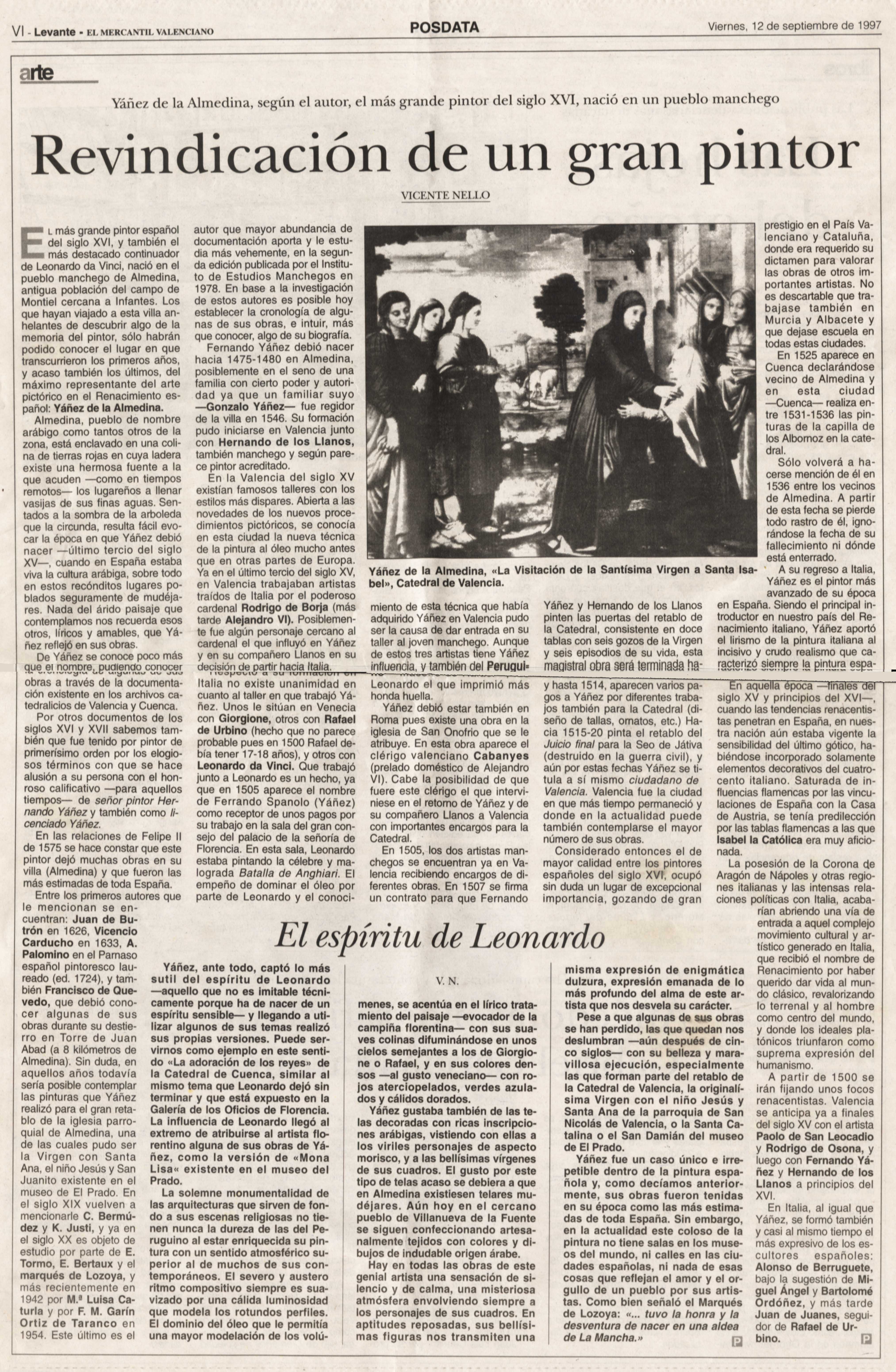Artículo publicado en el diario Levante-emv el 12 de septiembre de 1997 referente a la restauración del retablo mayor de los Hernandos de la Catedral de Valencia