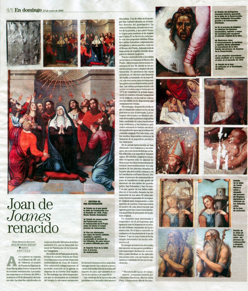 Artículo nuestro publicado en el diario Levante-emv el 23 de enero de 2005, referente a la restauración del retablo mayor de Joan de Joanes de la Font de la Figuera.