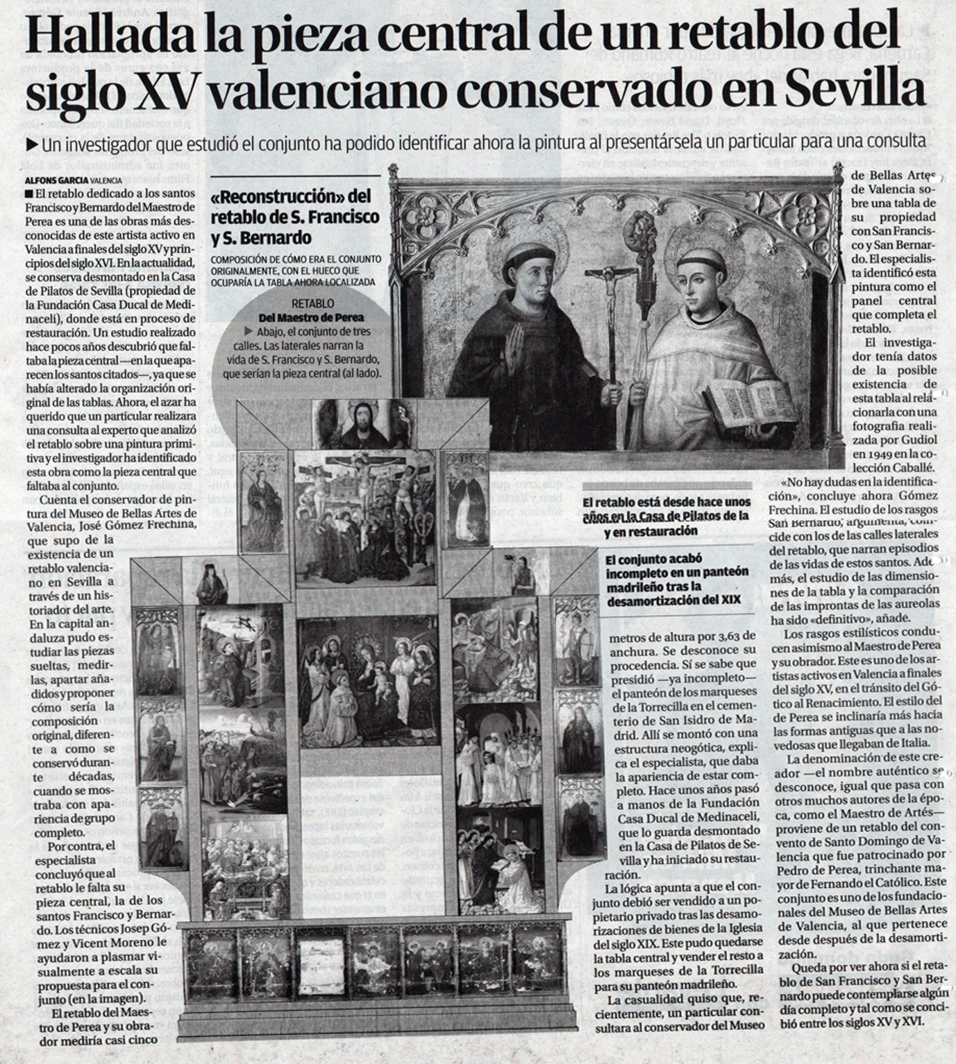 Artículo publicado en el diario Levante-emv el 2 de agosto de 2014, referente al hallazgo de una tabla del Maestro de Perea restaurada por nosotros.