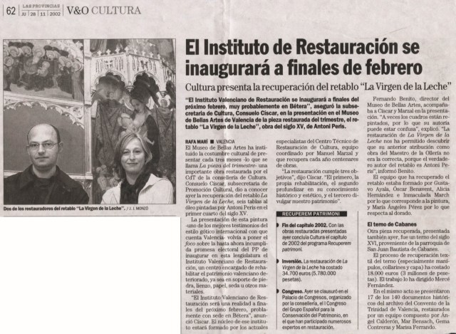 Artículo publicado en el diario Las Provincias el 28 de noviembre de 2002 referente a la restauración del retablo de la Virgen de la Leche de Antoni Peris del Museo de Bellas Artes de Valencia.