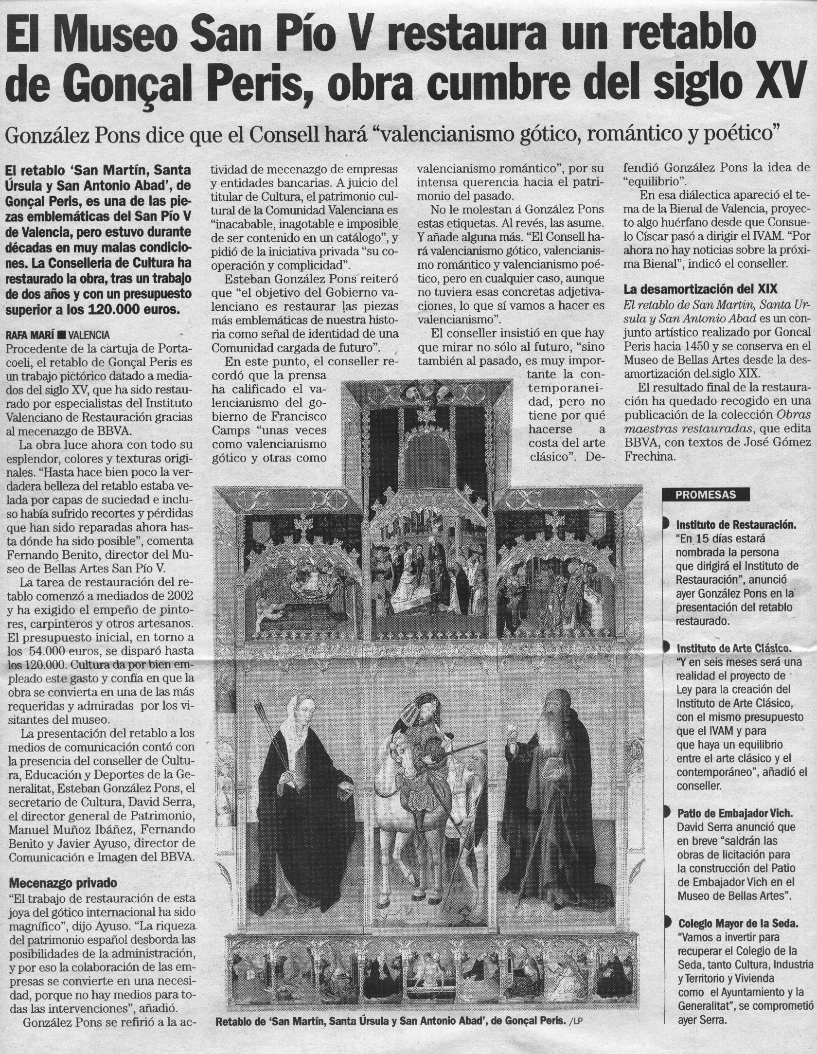 Artículo publicado en el diario Las Provincias el 26 de mayo de 2004 referente a la restauración del retablo de Santa Úrsula, San Martín y San Antonio Abad de Gonçal Peris Sarrià del Museo de Bellas Artes de Valencia.