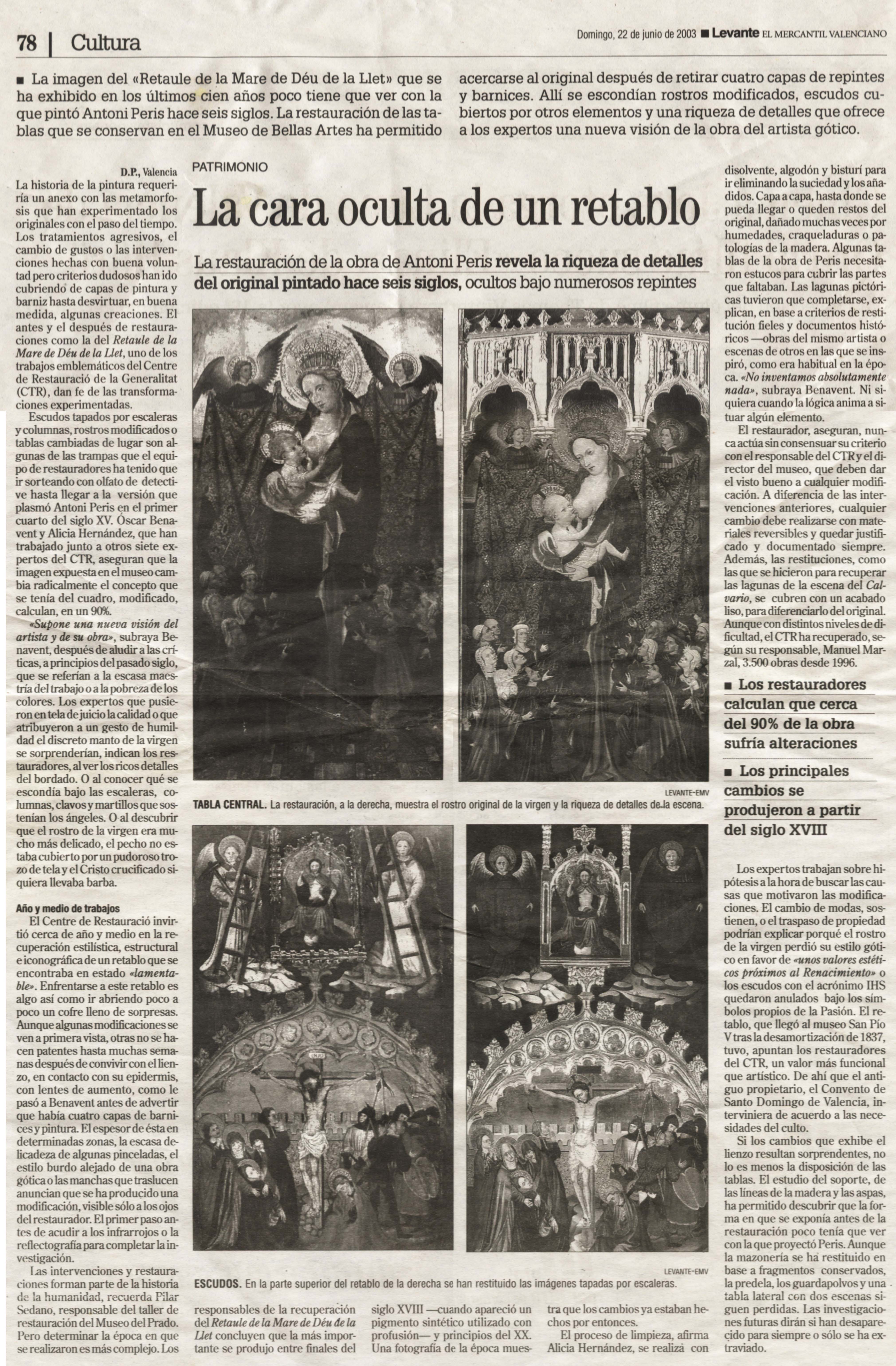 Artículo publicado en el diario Levante-emv el 22 de junio de 2003 referente a la restauración del retablo de la Virgen de la Leche de Antoni Peris del Museo de Bellas Artes de Valencia.