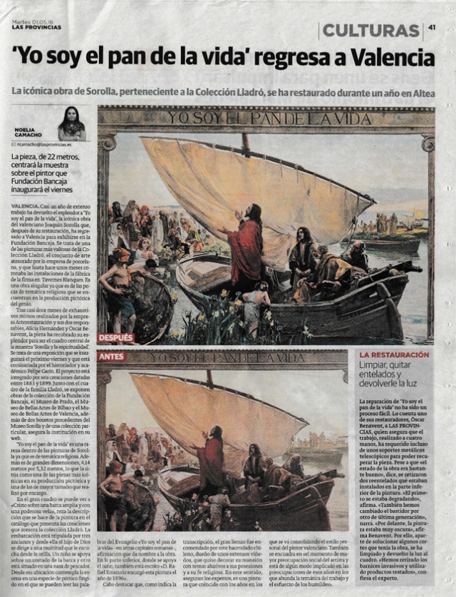 Artículo publicado en el diario Las Provincias el 4 de mayo de 2018, referente a la exposición en la Fundación Bancaja «Sorolla y la espiritualidad», en la que se presentó la obra «Yo soy el Pan de la Vida» de Joaquín Sorolla i Bastida recién restaurada por nosotros.